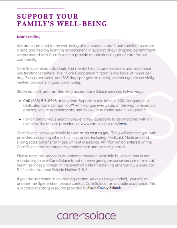 Irwin County Schools Selects Care Solace for Mental Health Care Coordination Services